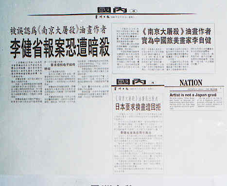 当地中文报及媒体都以相当大的着篇幅报导了李健省的《南京大屠杀》油画险被撤换的新闻,同时也对荷兰当局尊重艺术与历史的态度赞扬。 曾参管过画展的中国记者也对李健省的《南京大屠杀》印象深刻,认为这画真实地再现了日本军国主义分子的惨无人道,尤其是画中的那两个军官, 其中一个在狞笑着擦拭军刀上的血迹。一名官员也激动的说: “我要带我的孩子来看这幅画,让我的孩子不要忘记这过去的一幕。让他再告诉他的孩子, 这样的事情,永远不可以再发生”。李健省是马来西亚艺术家,曾在日本游学多年,从事比较艺术研究,擅长绘画,蜡染,染色及雕塑,曾获多项国家与国际荣誉。荷兰泽斯特皇宫也特地安排了李健省为荷兰女皇绘画全身肖像。 (马来西亚星洲日报 Malaysia 2000年2月20日(星期日)